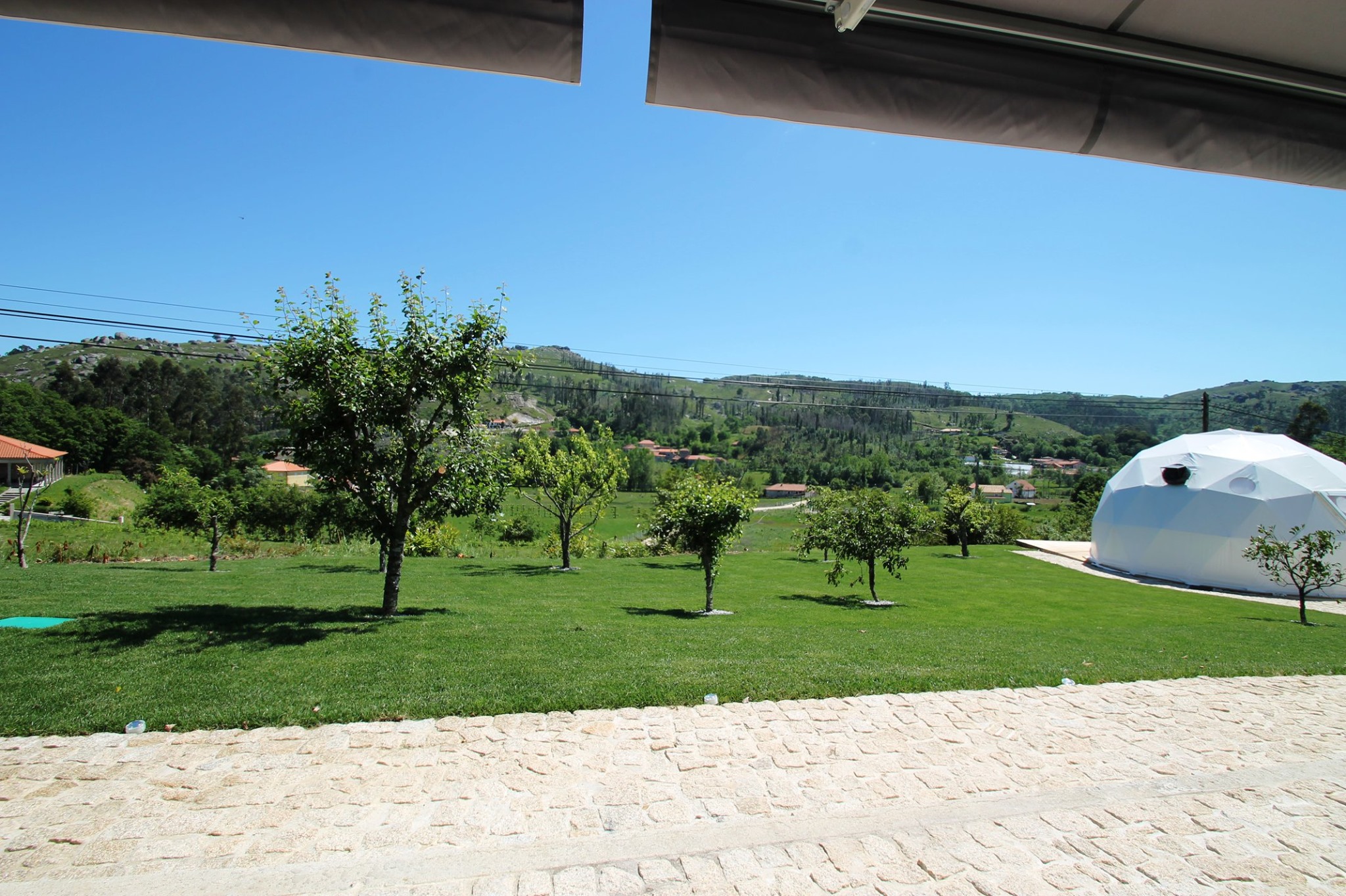 De tuinkamers kijken uit op de boomgaard en zijn gesitueerd tussen de dome-tenten en ook het zwembad met sauna en whirlpool. Beide kamers hebben buiten een ook gezellig terras met zitje. Erboven ook een zonnescherm inclusief ledverlichting.